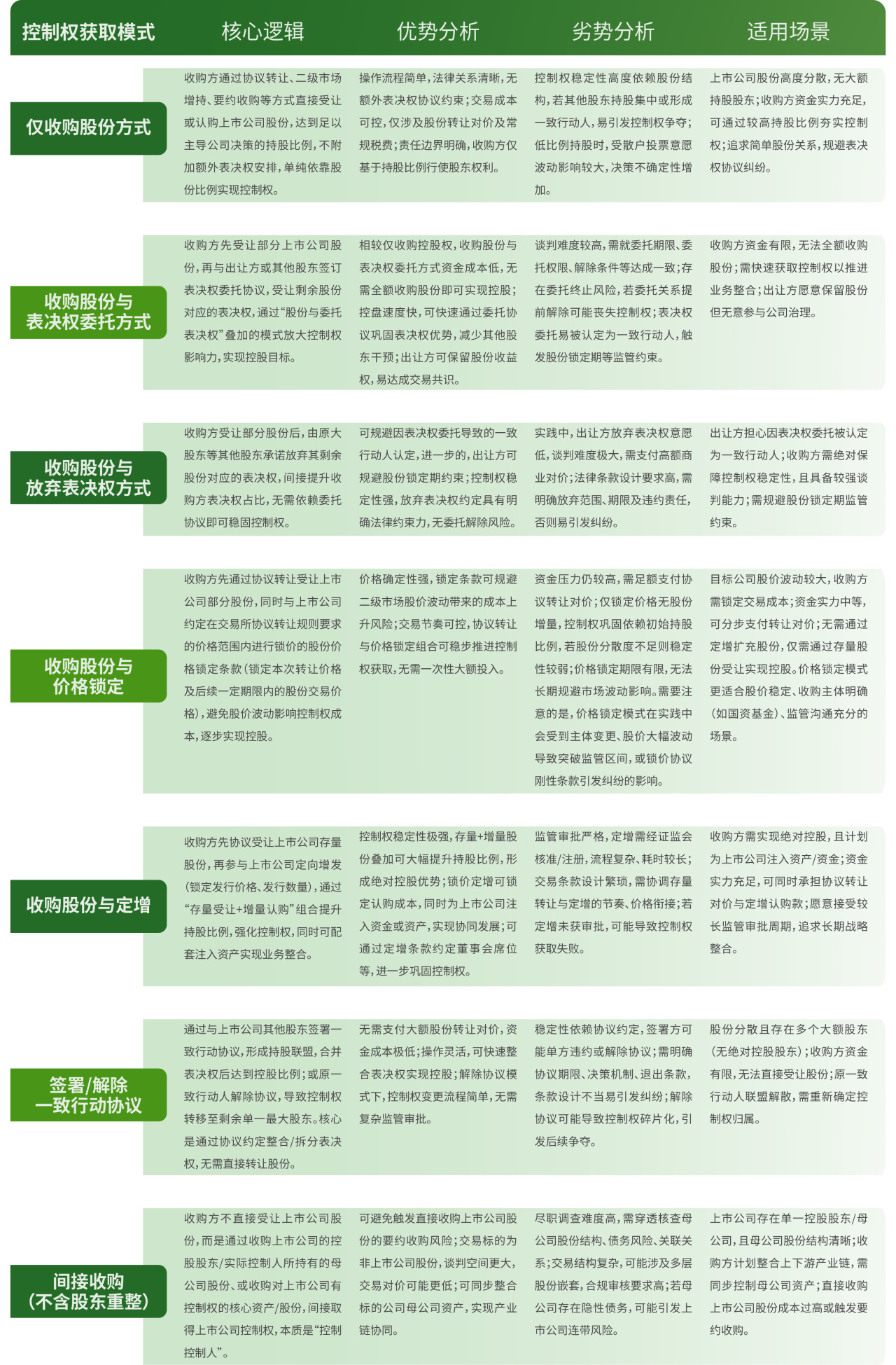 收购上市公司控制权(即上市公司控制权变更)以协议转让(包括协议转让加其他方式)为主,同时,签署或解除一致行动协议、间接收购(不含股东重整)也是较为常见的控制权变更方式,各类模式及细分方案的核心逻辑、优劣势及适用场景如下: